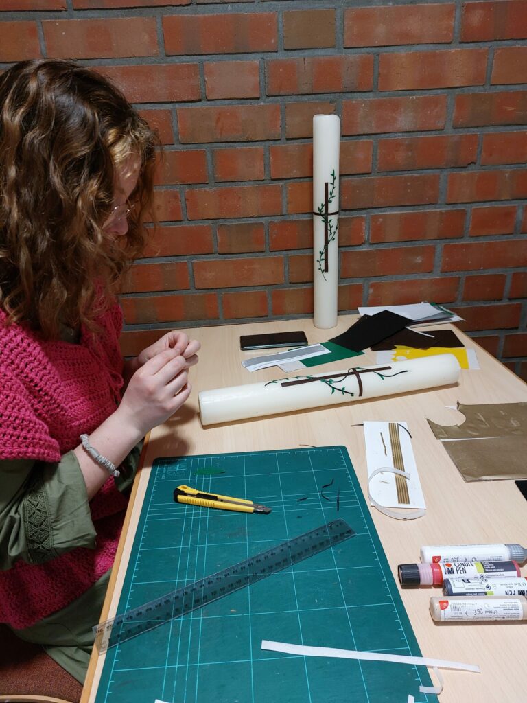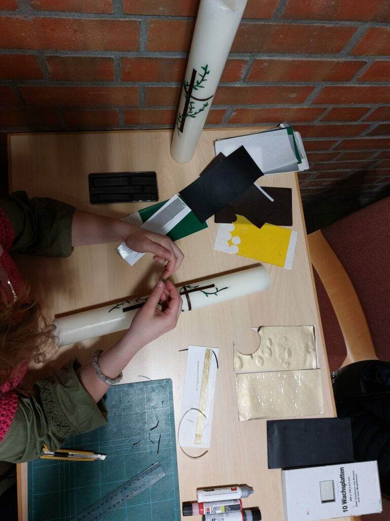 Noch übrig aus vorigen Jahren waren zwei große Leuchterkerzen. Mit vorhandenen Wachsplättchen sind daraus zwei kunstvoll gestaltete Osterkerzen entstanden, für die gemeinsam das Motiv kreiert wurde. Die beiden Osterkerzen werden jeweils in Radeberg und Dresden den Altar erstrahlen lassen. Wer gern zu Taufe, Kommunion, Konfirmation, Hochzeit, Trauer selbst eine Kerze gestalten möchte und etwas Anleitung braucht, ist herzlich eingeladen, mit Kerze das nächste Mal vorbeizukommen.