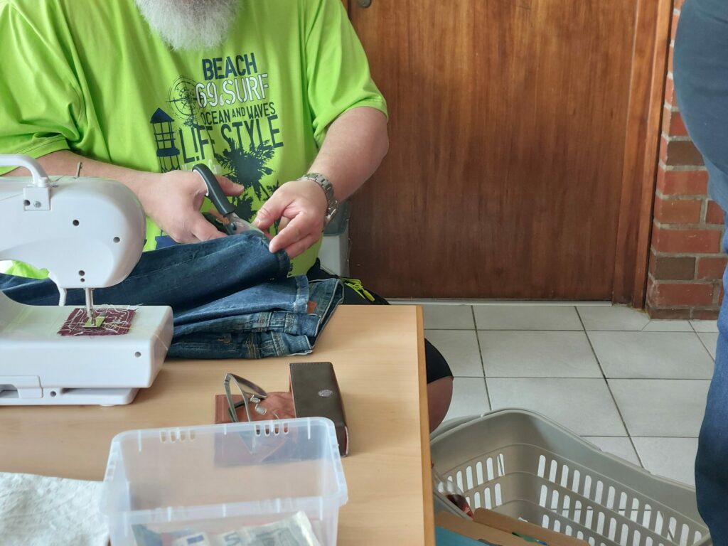 Wie funktioniert meine Nähmaschine und wie kürze ich selbst? Diese Fragen standen im Raum und wir haben uns gemeinsam an die Lösung herangetastet. Dabei stellte sich heraus, dass die mitgelieferten Plastikspulen nicht funktionierten, da der Unterfaden magnetisch gebremst wird, was Plastik einfach nicht tut. Nach dem Umspulen auf Metallspule klappte es und unser Gast hat vor Ort das erste Bein seiner Hose gekürzt, und geht zuhause das zweite Bein an.