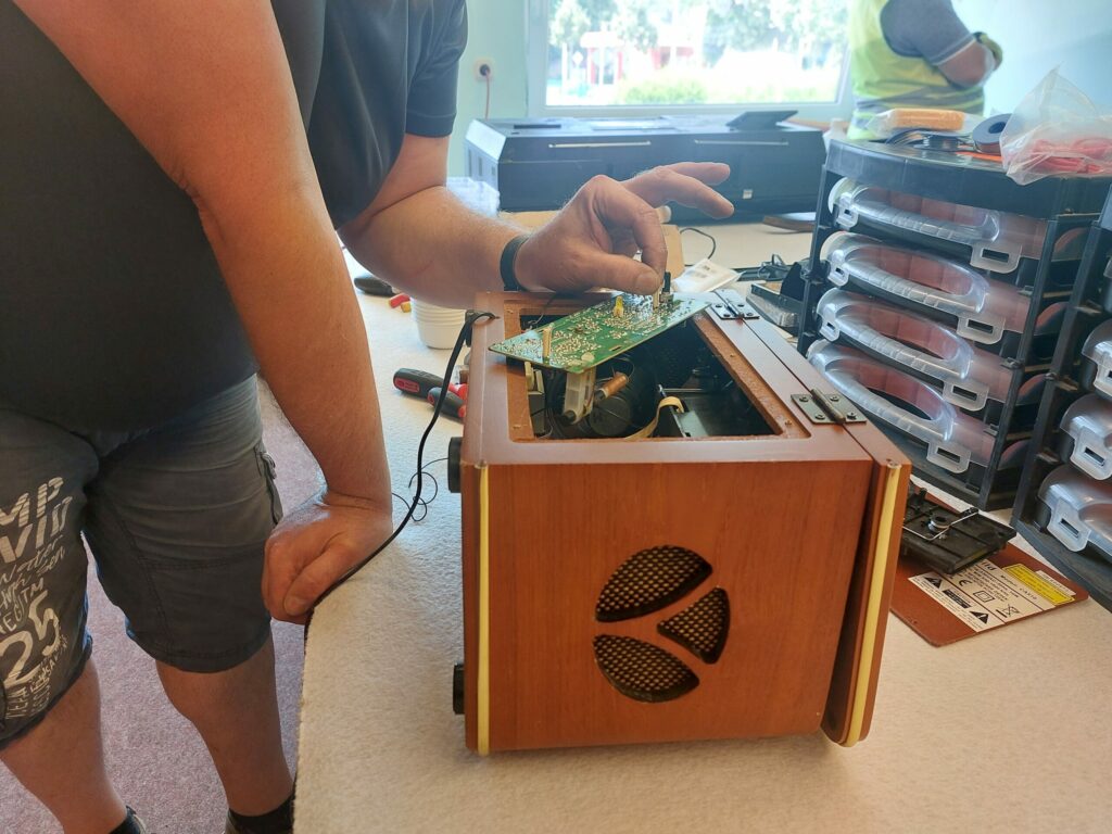 • Als Fehler wurden verschlissene Gummis ausgemacht, die wir zwischenzeitlich bestellten und vor Ort austauschten. Kurz vor Ende unserer ReparierBAR tönten dann gemütliche Töne aus dem Tape – und es machte sich so richtig entspannte Stimmung breit. Ein wirklich seltenes Gerät in der heutigen Zeit, wenn auch ziemlich sperrig 😉.