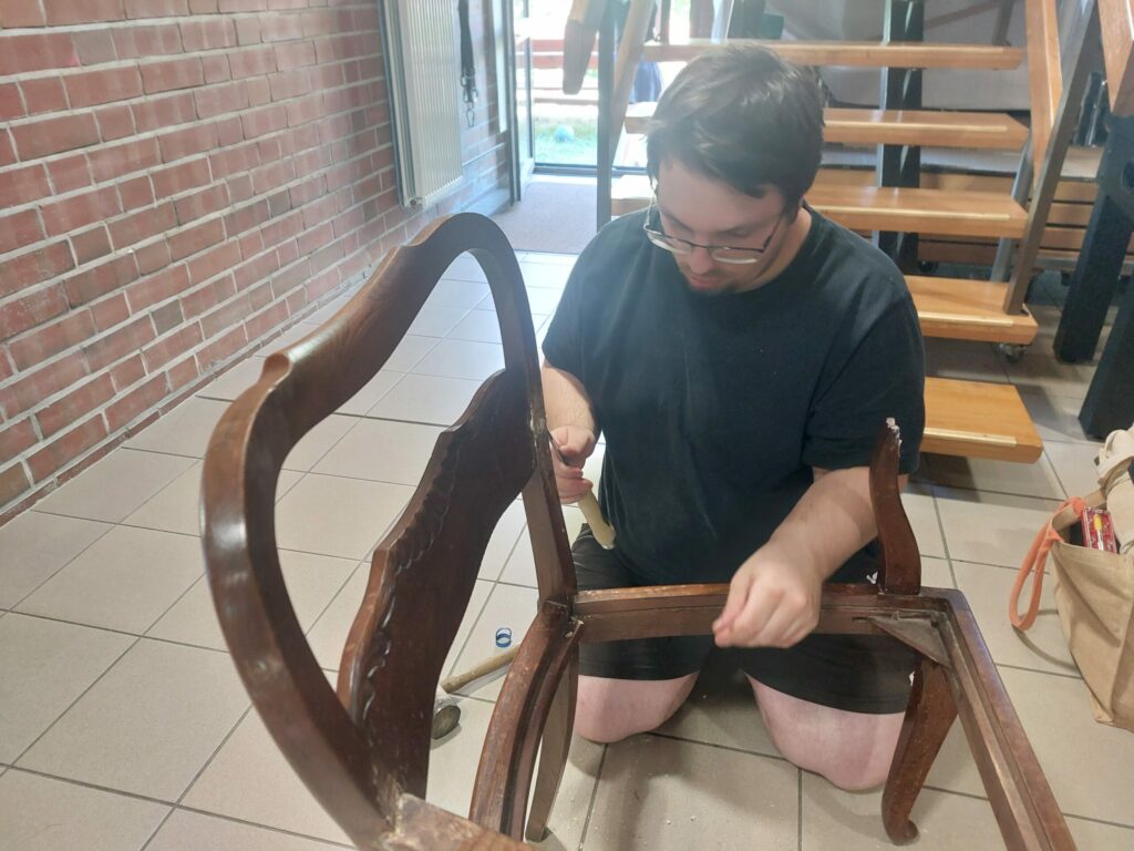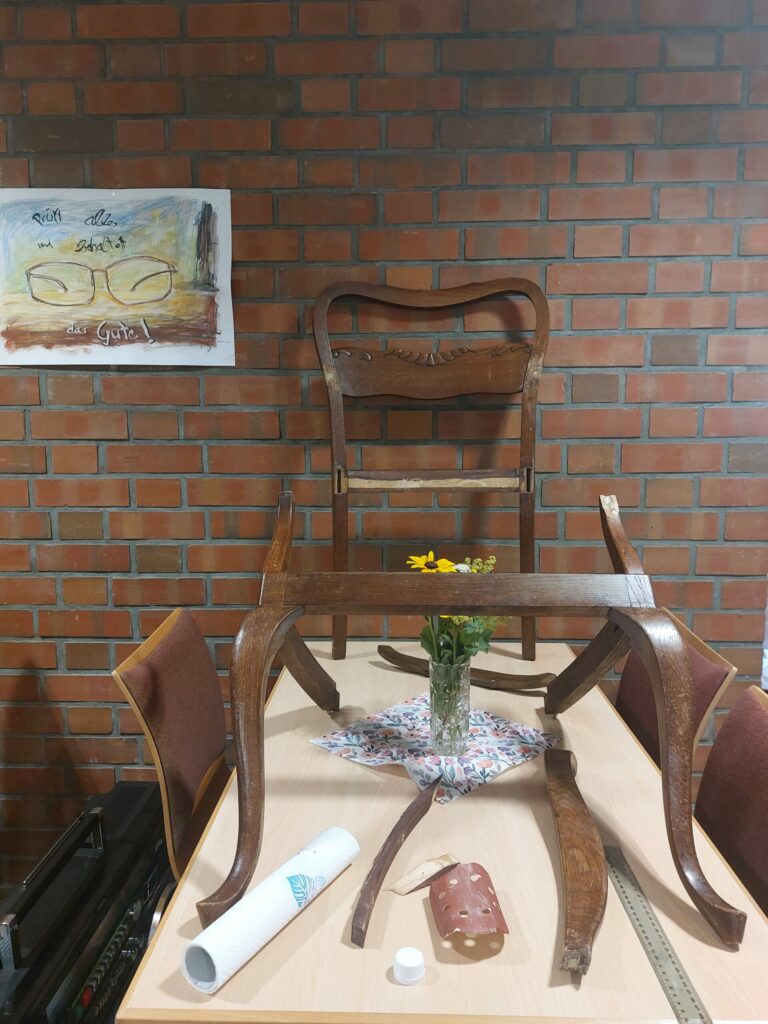 • Nachdem die erste Lehne fachmännisch eigentlich nahezu restauriert wurde, wurde uns in der laufenden ReparierBAR der Rest des Stuhles vorbeigebracht. Ein externer Reparaturversuch, die Armlehnen zu befestigen, hat eher mehr Schaden gemacht als vorher war. Unser Tischler hat dies alles erstmal wieder rückgemacht, verschliffen, sodass als nächstes Fehlstellen repariert, neu gedübelt und lasiert bzw. lackiert werden kann.