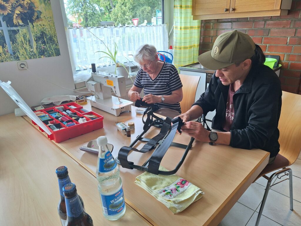 4. Auch für die Sektion Nähen gab es zu tun, denn an einem Gestell die Verbindung zum Gurt defekt. Auch hier konnten wir Abhilfe schaffen. Das Gepäckstück ist wieder voll funktionstüchtig.