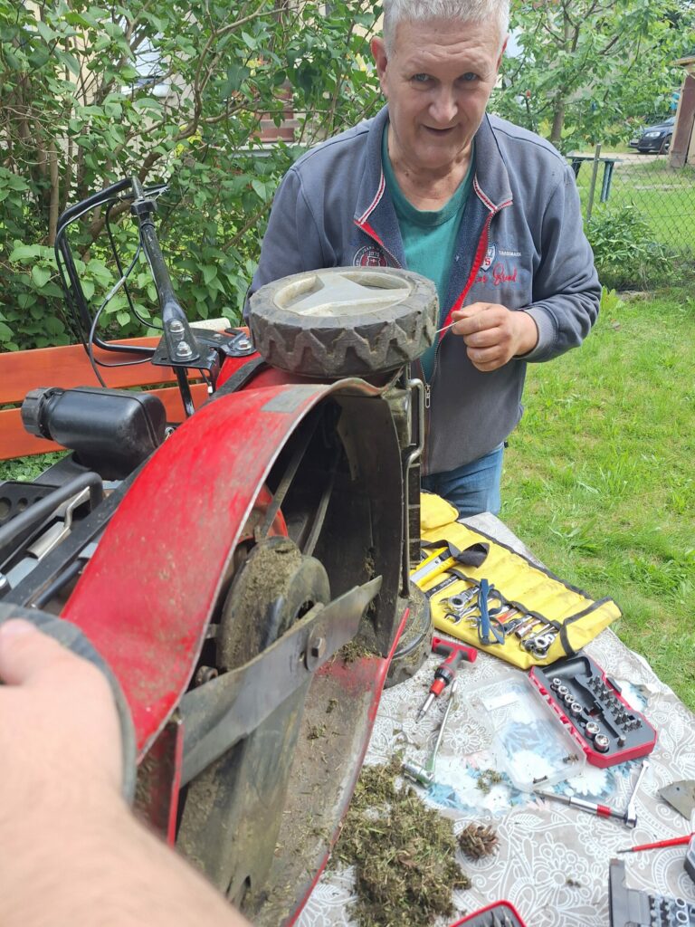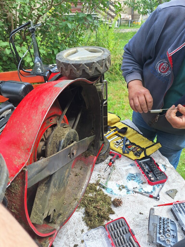 6. Rasenmäher – Verklemmter Stein hebt Riemen aus den Angeln … ein kleiner „Steinschlag“ löste eine Kettenreaktion aus, denn erst war der Riemen runter und dann die Feder einschl. Schraube ab. Stück für Stück sind wir dem Fehler auf die Schliche gekommen, im Dreck haben wir sogar die nötige Feder und Schraube gefunden, sodass das Gerät wieder repariert werden konnte. Es freut uns ganz besonders, denn der Mäher ist kaputt gegangen, als er dem Nachbarn helfen wollte.